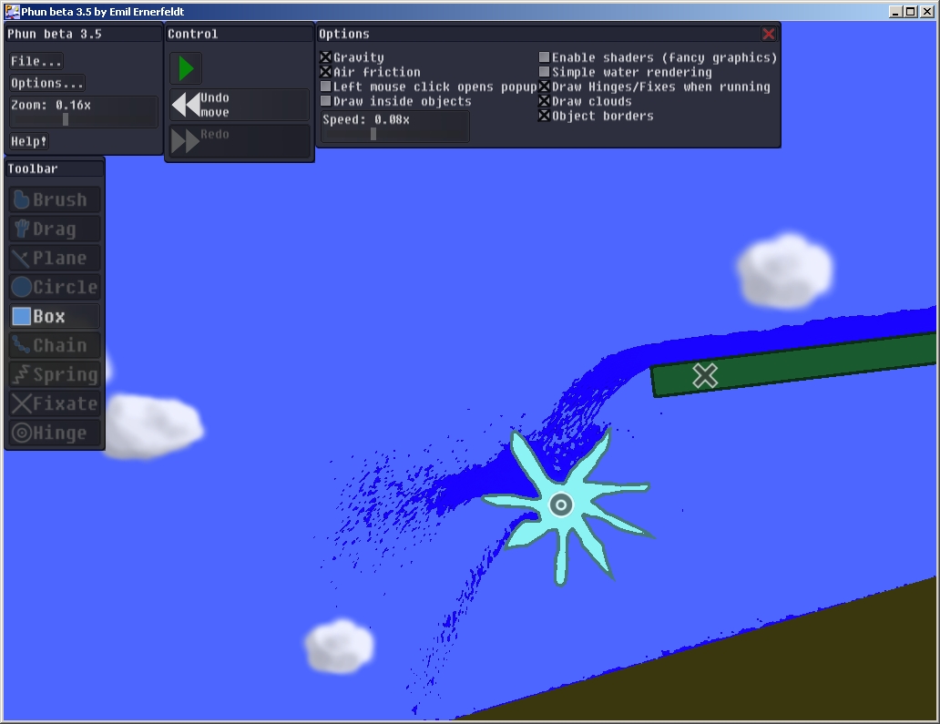 Ich hab gerade die für nichtkommerzielle Verwendung freie Software Phun getestet und bin total begeistert. Ich könnte mich stundenlang damit spielen. Phun ist ein digitaler Physik-Baukasten. Die beiden Screenshots dürften euch ein gutes Bild seiner Möglichkeiten bieten.