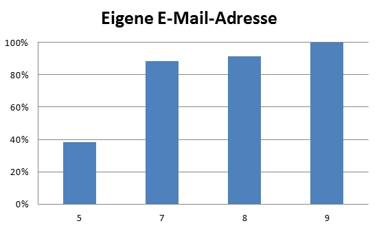 Von 97 Schülern hatten 86 Prozent eine eigene E-Mail-Adresse. Der Schnitt wird durch die 5. Jahrgangsstufe (erfreulicherweise) gedrückt. In der 9. Klasse hat jeder eine eigene E-Mail-Adresse.