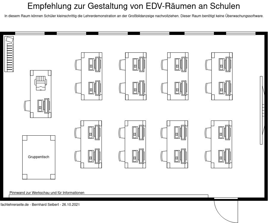 Meine Schüler müssen sich nicht umdrehen. Der Lehrer sitzt hinter den Schülern aber die Präsentation ist vor ihnen. Wenn du meine Skizze anschaust, dann ist rechts der Großbildmonitor.Charly hat geschrieben: 26.10.2021 21:43 z. B. Lehrer hinter den Schülern, seitlich zu den Schülern usw. ... für WiK, Tastschreiben und IT ... nur von Nachteil.