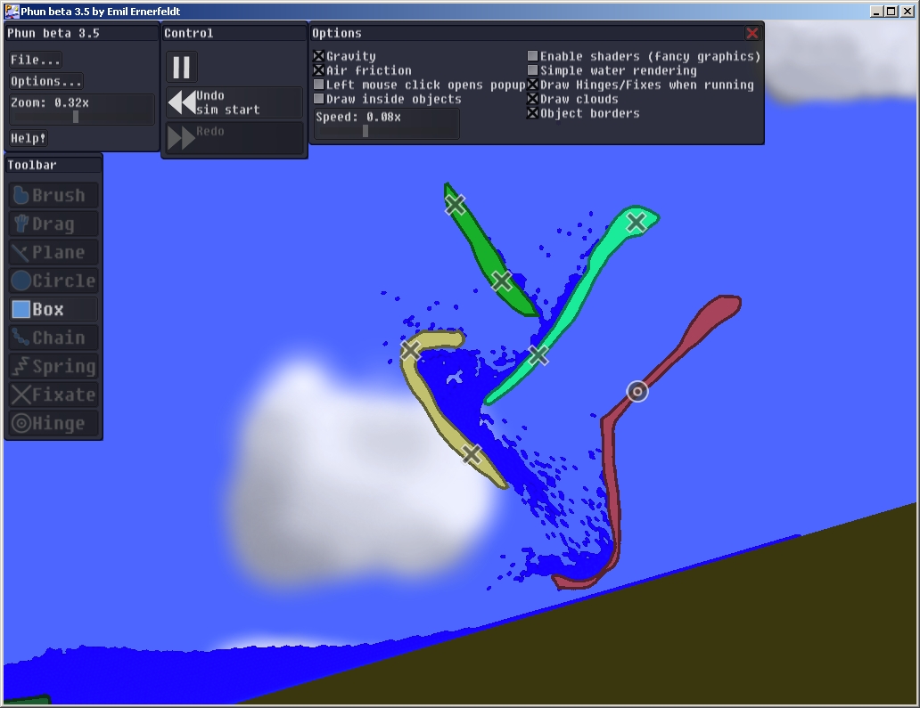 Ich hab gerade die für nichtkommerzielle Verwendung freie Software Phun getestet und bin total begeistert. Ich könnte mich stundenlang damit spielen. Phun ist ein digitaler Physik-Baukasten. Die beiden Screenshots dürften euch ein gutes Bild seiner Möglichkeiten bieten.