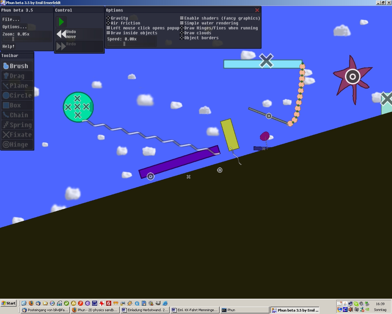Ein weiteres Programm ist PHUN. PHUN ist sozusagen ein virtueller Physik-Sandkasten und läd damit nicht nur Kinder zum Spielen ein.